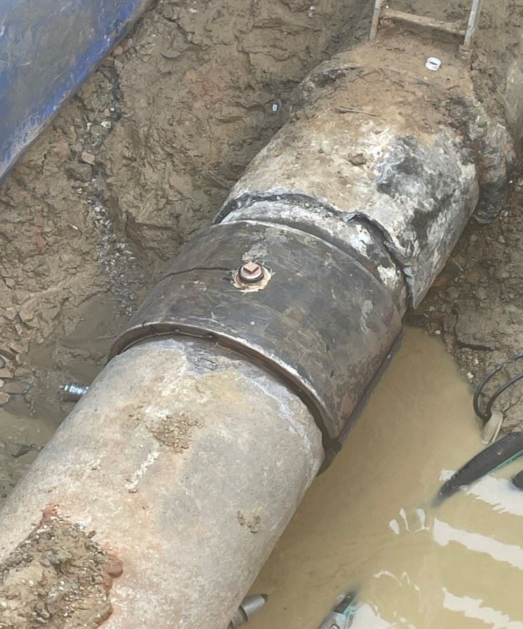 On Friday, July 7, 2023, a coordination meeting was held to review options for the repair. Due to the composition of the pipe, Thompson Pipe Group was contacted to arrange for the delivery of a clamp to be welded onto the pipe. At this time, RBIS began preparing the pipe by removing the outer concrete to accommodate the clamp.