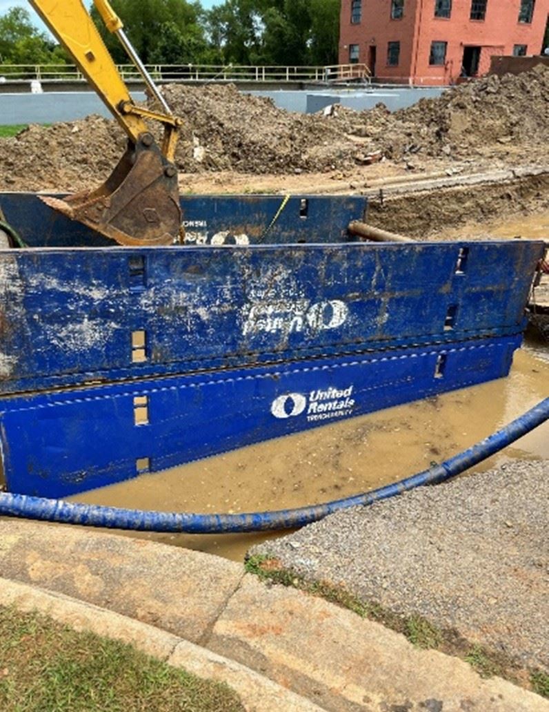 On Tuesday, July 4, 2023, RBIS completed the excavation and began pumping water from the pit to expose the lines. Leaks were discovered on the 30-inch Reinforced Concrete Cylinder Pipe (RCCP) originally installed in 1965. One leak was from a crack in the bell of the pipe and another from a previously installed tap. City staff and the contractors met to determine how the leaks would be repaired.